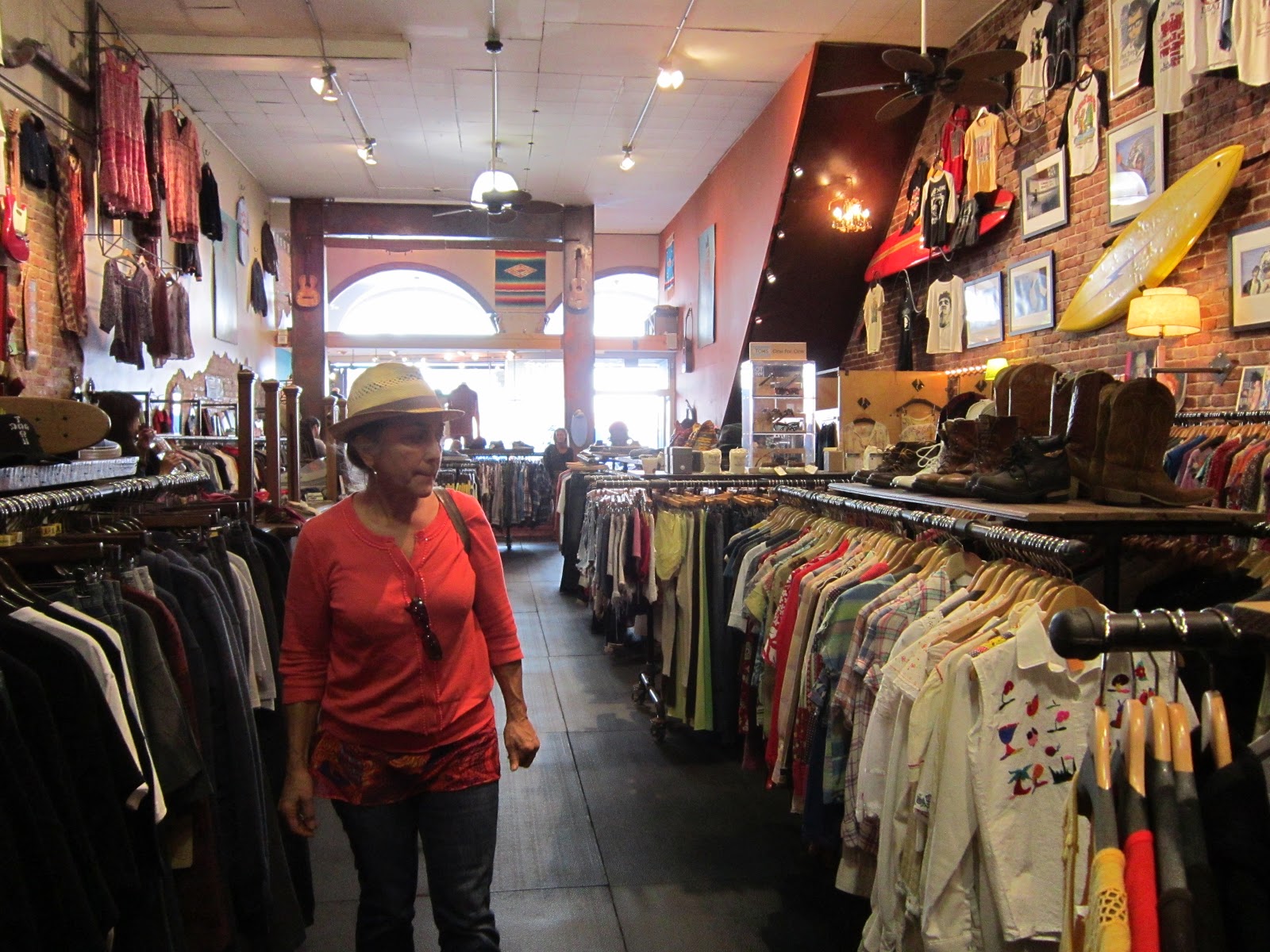I had planned to visit at least 5 stores that were near the Venice Oceanfront area. Unfortunately, 3 of them had closed. But I was able to visit 2 fantastic vintage stores near the beach. Animal House (66 Windward, Venice, CA (310) 392-5411, animalhousevenice@gmail.com), which is only a half block from the Oceanfront, is a wonderful store. It combines the spirit of the Southern California beach scene with vintage clothing from various eras. And the prices at Animal House are very reasonable. Most of the dresses, coats, etc. that we found and admired were $20 or less. I would definitely recommend that you check out this store.
